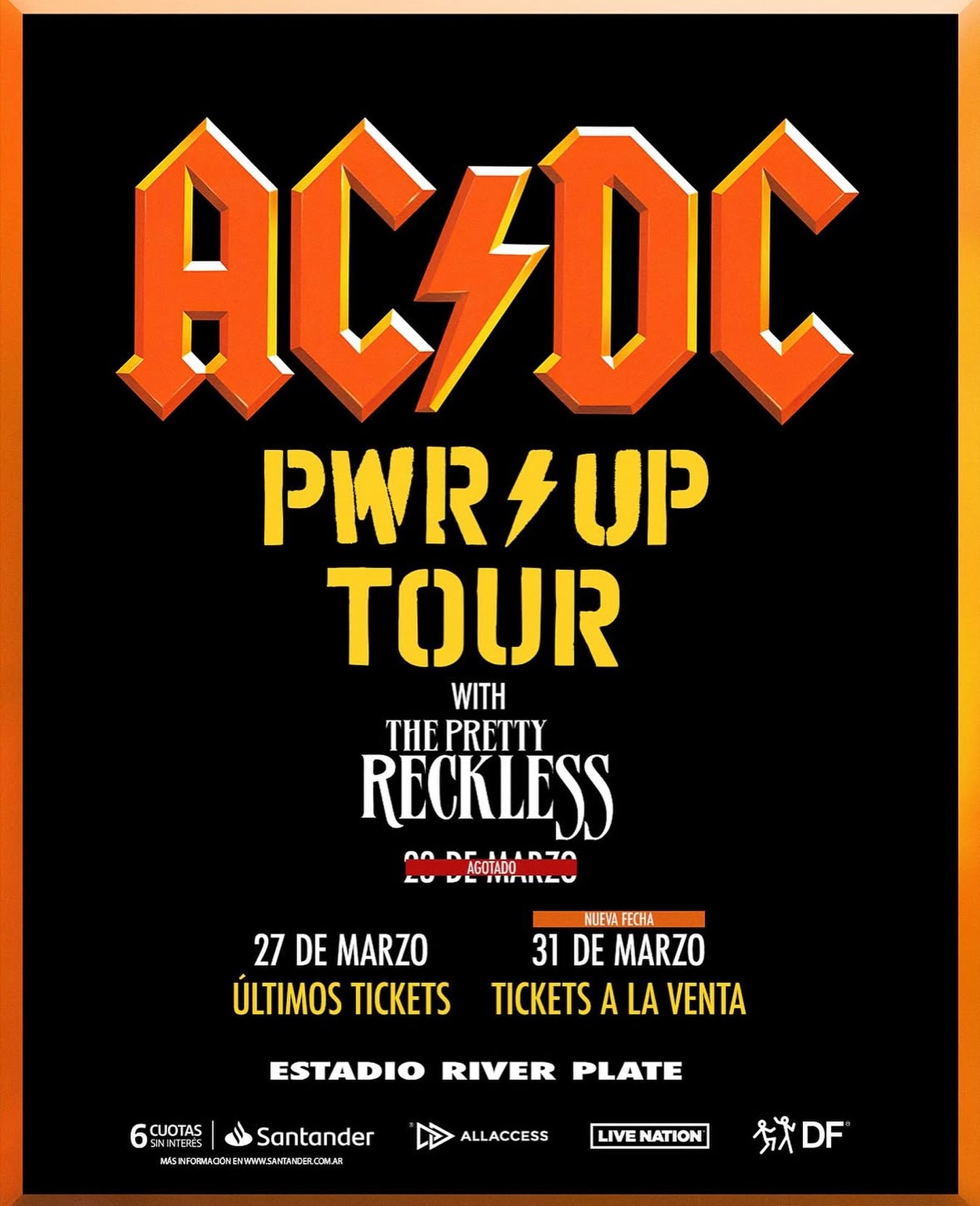 AC/DC agota y confirma dos nuevas fechas en ArgentinaArgentinaNoticias[Eventos] por Frank Hernández - 07/11/202523/01/2026 AC/DC confirmó dos nuevas fechas en el Estadio River Plate luego de agotar en tiempo récord las entradas para su primer concierto en Buenos Aires. Los nuevos shows se realizarán el 27 y el 31 de marzo, y se suman a la función previamente anunciada para el 23 de marzo, marcando el regreso del grupo al país después de 16 años.Las presentaciones forman parte del POWER UP TOUR, la gira mundial que acompaña a su más reciente álbum de estudio Power Up, que alcanzó el puesto número uno en más de 21 países. El recorrido en vivo incluirá un repaso por clásicos centrales de su carrera como “Highway to Hell”, “Thunderstruck” y “Back in Black”.Las entradas para las nuevas fechas están disponibles a través del sistema AllAccess. Los precios informados para los shows oscilan entre $165.000 y $345.000 (más cargos por servicio), según la ubicación dentro del estadio.En estas fechas en Buenos Aires, AC/DC contará con THE PRETTY RECKLESS como banda invitada. El grupo estadounidense, liderado por Taylor Momsen, acompañará a los australianos durante su paso por el Estadio Monumental. La última visita de AC/DC a la Argentina fue en 2009, cuando se presentaron en River Plate como parte del Black Ice Tour, en una serie de conciertos que convocaron a más de 200.000 personas y que quedaron registrados en un documental oficial de la banda.Con estas nuevas funciones, el regreso de AC/DC a la Argentina se consolida como uno de los eventos más convocantes del calendario musical de 2026.