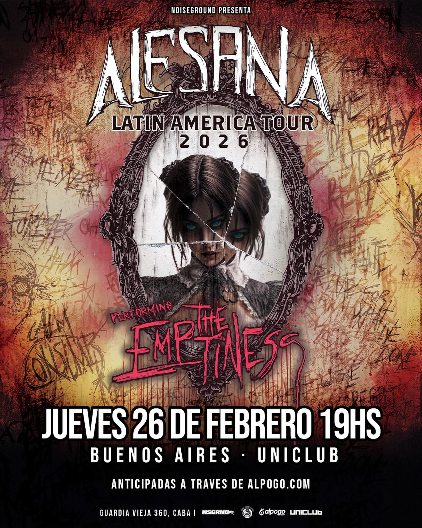 ALESANA confirmó su regreso a la Argentina en FebreroArgentinaNoticias[Eventos] por Alejandro Gonzalez - 11/01/202611/01/2026 ALESANA, originarios de Raleigh, North Carolina, regresan a Argentina en el marco de su gira «Latin American tour 2026». La banda, formada en 2004, ofrecerá un concierto especial donde interpretarán su tercer disco, The Emptiness (2010), en su totalidad, junto a una selección de otros clásicos de su carrera.El show se llevará a cabo el jueves 26 de febrero en Uniclub, ubicado en Guardia Vieja 3360, C.A.B.A. Las entradas anticipadas ya están disponibles a través de Alpogo, con un valor de $90.000 (más cargos por servicio).Por el momento, no se ha confirmado información sobre las bandas nacionales que abrirán el concierto.Con su mezcla única de post-hardcore, screamo y dramatismo gótico, ALESANA se ha convertido en una de las bandas más queridas de la escena alternativa. Formados en el 2004, llevan más de dos décadas creando historias sonoras cargadas de emoción, romance oscuro y explosiones catárticas. Entre toda su discografía, hay una obra que ha marcado para siempre a sus fans: “The Emptiness”, un álbum conceptual inspirado en el horror clásico y la literatura victoriana, donde la banda narra una tragedia emocional al ritmo de breakdowns, coros desgarradores y pasajes instrumentales cargados de tensión.
