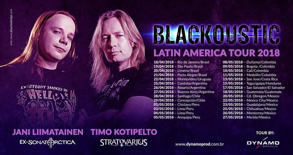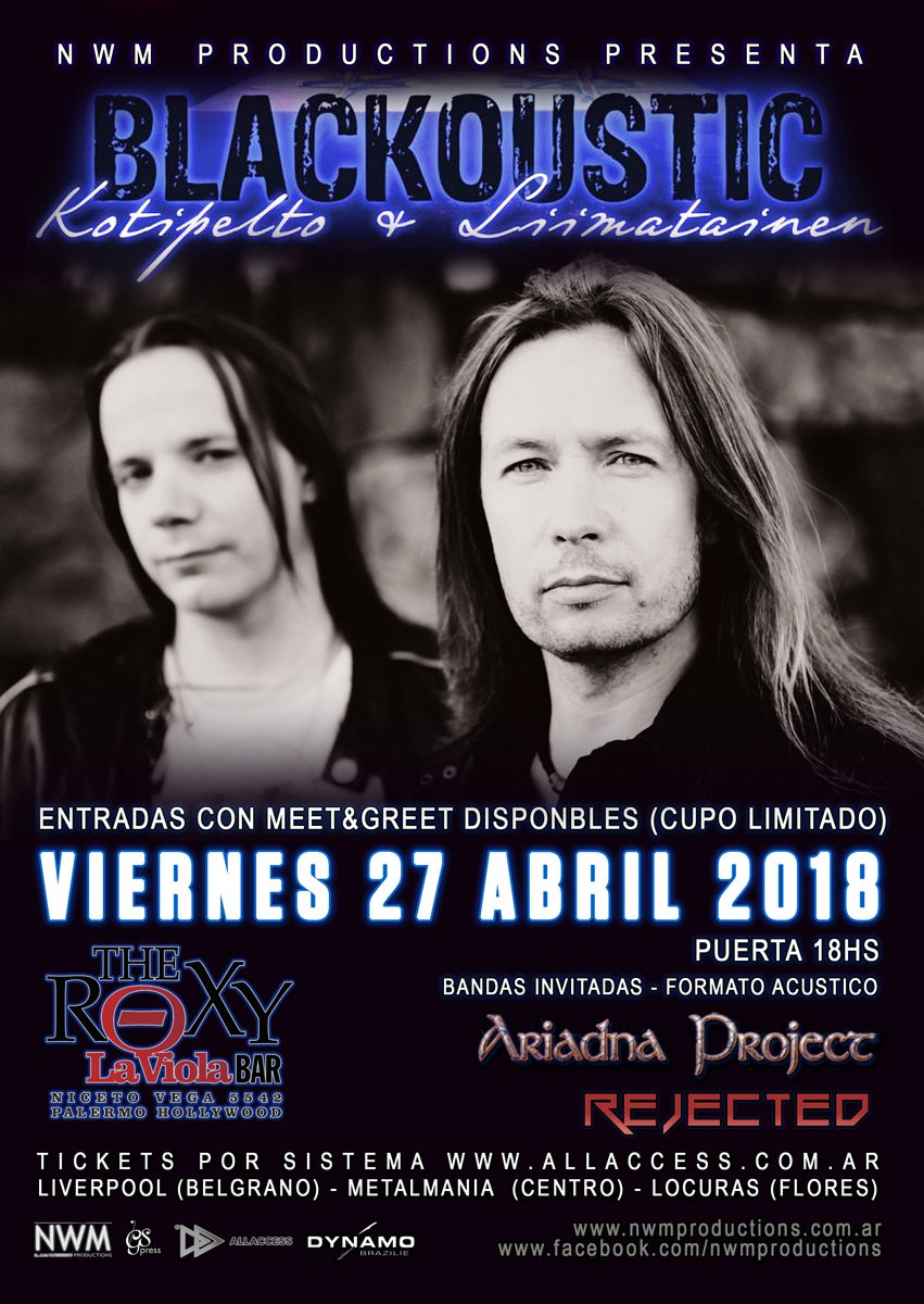 BLACKOUSTIC en Buenos AiresArgentina[Eventos] por Frank Hernández - 22/04/201814/01/2022 El proyecto acústico liderado por Timo Kotipelto (STRATOVARIUS) y Jani Liimatainen (ex – SONATA AARCTICA) se presentará el día viernes 27 de abril en la capital argentina, específicamente en The Roxy La Viola Bar (Niceto Vega 5542). El formato de este show permitirá al público vivir una experiencia cercana y participativa con el gran dúo, y será la oportunidad de ver en vivo por primera vez en el país a Jani Liimatainen, además que se podrá disfrutar una vez más de Timo Kotipelto, una de las voces representativas del power metal.El show incluye la interpretación de grandes éxitos del Rock además de los clásicos de STRATOVARIUS y SONATA ARCTICA, entre otros.Habrán entradas limitadas con Meet&Greet. El mismo se desarrollará el día del show en The Roxy La Viola Bar a las 17hs, podrán llevar 3 cosas para firmar y un fotógrafo de la productora les sacará fotos con los integrantes de BLACKOUSTIC.Bandas invitadas en formato acústico: ARIADNA PROJECT y REJECTED. Entradas a través de sistema All Access (click al boton verde) y también disponibles en:METALMANIA: Lavalle 669 Loc.9 – Gal. Luxor – Cap. Fed. LIVERPOOL: Av. Cabildo 2136 (Gal. Recamier) Local 147 – 1er Piso Belgrano (NO COBRAN SERVICE). LOCURAS FLORES: Nazca 22 – Cap. Fed. LOCURAS MORON: Av. Rivadavia 18050, Morón. LOCURAS ONCE: Av. Rivadavia 2734, CABA. LA ESTAKA: Peatonal Rivadavia 334 local 9 Quilmes.