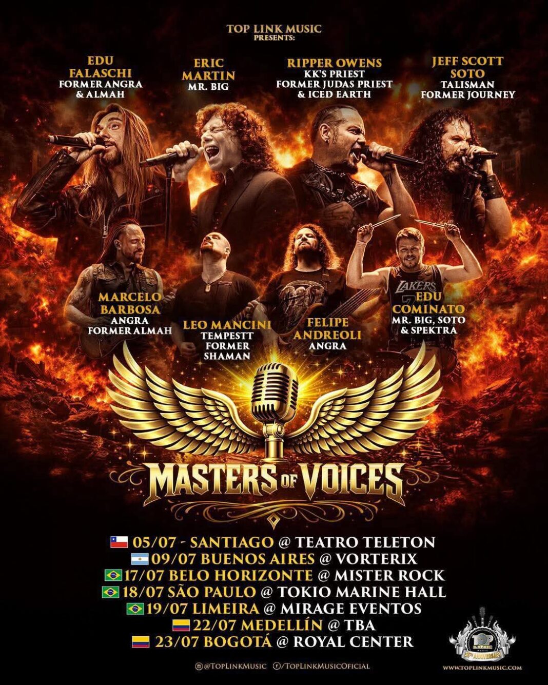 MASTERS OF VOICES: Eric Martin, Edu Falaschi, Tim «Ripper» Owens, Jeff Scott Soto y más se presentarán en ArgentinaArgentinaNoticias[Eventos] por Leticia Villalba - 11/03/202611/03/2026 Figuras destacadas del hard rock y el heavy metal ofrecerán un show el 9 de Julio en el Teatro Vorterix de Buenos Aires en el marco del «Tour Latinoamericano 2026».Las reconocidas voces de Eric Martin (Mr. Big), Edu Falaschi (Angra/Almah), Tim “Ripper” Owens (Judas Priest / KK’s Priest / Iced Earth) y Jeff Scott Soto (Talisman, Journey, Yngwie Malmsteen) se unen en Masters Of Voices un espectáculo especial que reunirá en una misma noche grandes clásicos del hard rock y el heavy metal internacional.El espectáculo estará acompañado por una banda de primer nivel integrada por Felipe Andreoli en bajo, Marcelo Barbosa y Leo Mancini en guitarras, y Edu Cominato en batería, lo que asegura una presentación intensa y cargada de energía para los fanáticos del género.Con un repertorio especialmente seleccionado para la ocasión, Masters Of Voices llega a Buenos Aires como parte del «Tour Latinoamericano 2026» con fechas anunciadas en Chile, Brasil y Colombia. El encuentro será el día 9 de julio en el mencionado Teatro ubicado en el barrio de Colegiales (Av. Federico Lacroze 3455, CABA).La preventa ya se encuentra disponible en la web de AllAccess con un valor de $70.000 (mas cargos por servicio).