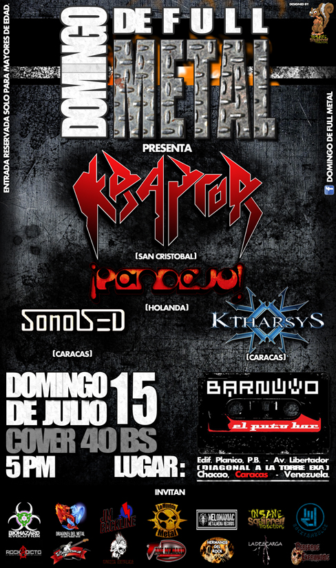El próximo Domingo 15 de Julio de 2012, el Bar Nuvo – mejor conocido como El Puto Bar de Caracas – ubicado en Chacao, se llenará de Metal con el «Domingo de Full Metal» que se realizará con las bandas KRAPTOR (San Cristóbal), KTHARSYS (Caracas) y SONOSED (Caracas) a partir de la 5 pm y por tan solo 40 Bsf.