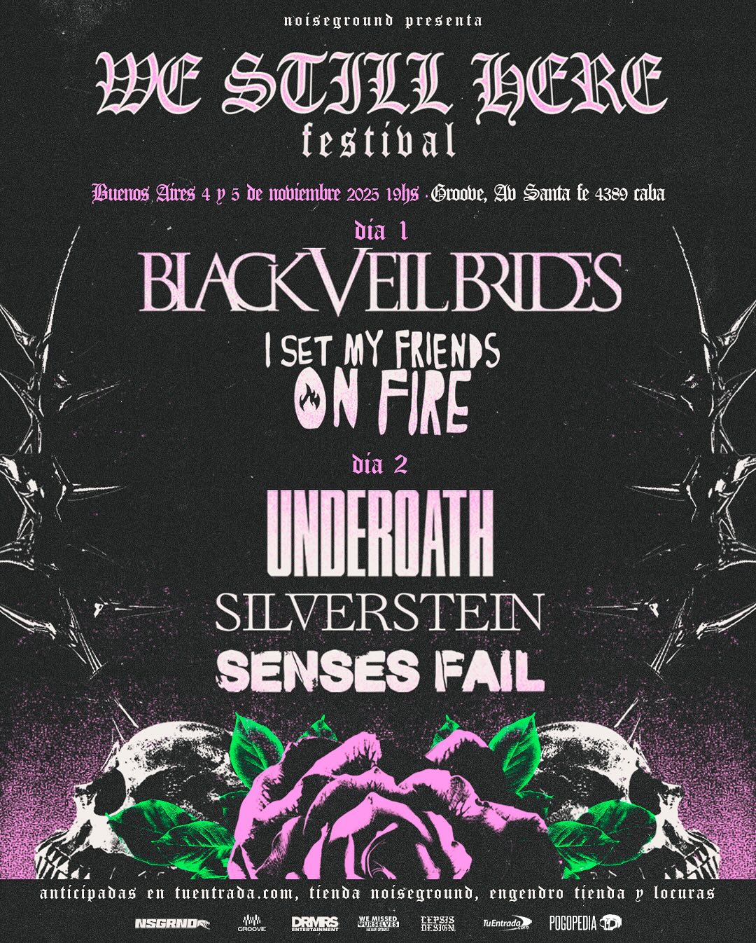 Festival WE STILL HERE anuncia primera edición en Buenos AiresArgentinaNoticias[Eventos] por Frank Hernández - 02/07/202527/10/2025 Los días 4 y 5 de noviembre de 2025, Buenos Aires será sede de la primera edición del WE STILL HERE FESTIVAL, un encuentro dedicado a la música emo y post-hardcore que marcaron a una generación. El evento reunirá en un mismo escenario a artistas internacionales y nacionales representativos del género.El festival se realizará en Palermo Groove (Av. Santa Fe 4389, C.A.B.A.) y contará con dos jornadas consecutivas. Las entradas anticipadas con descuento y los abonos para ambos días ya están disponibles a través de TuEntrada.El Día 1, programado para el martes 4 de noviembre, tendrá como protagonistas a BLACK VEIL BRIDES y I SET MY FRIENDS ON FIRE, dos referentes del metalcore y el post-hardcore moderno.El Día 2, el miércoles 5 de noviembre, presentará a UNDEROATH, SILVERSTEIN y SENSES FAIL, tres de los nombres más influyentes de la escena emo internacional, conocidos por combinar intensidad sonora con letras cargadas de emotividad y reflexión. Con su primera edición en Argentina, el WE STILL HERE FESTIVAL busca consolidarse como un punto de encuentro para los seguidores del emo y el post-hardcore, géneros que siguen inspirando a nuevas generaciones de músicos y oyentes.