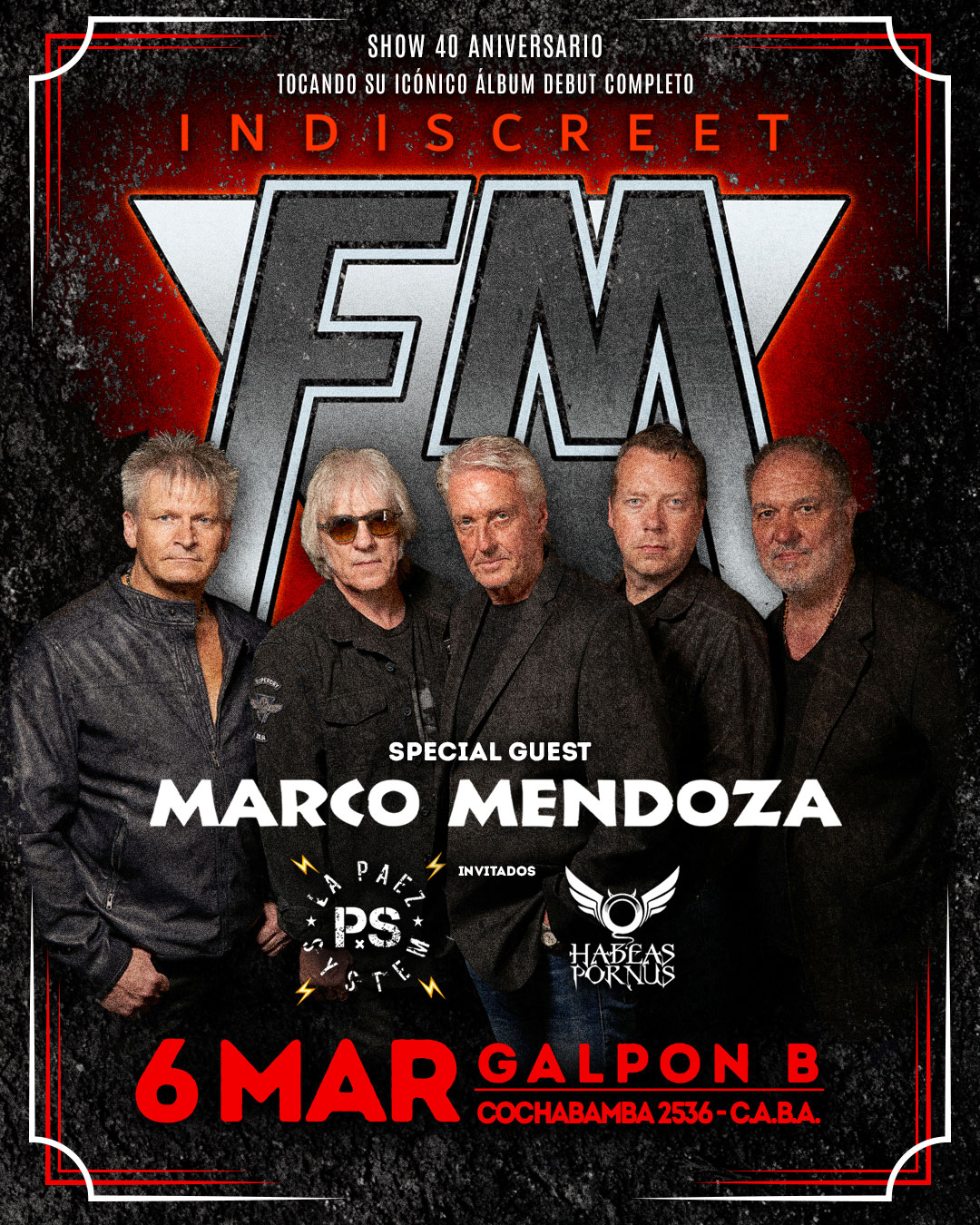 FM celebrará 40 años de «Indiscreet» en Argentina junto a Marco MendozaArgentinaNoticias[Eventos] por Leticia Villalba - 04/02/202607/02/2026 La banda de rock melódico británica se presentará el 6 de marzo 2026 en Galpón B en el marco de los 40 años de su álbum debut: «Indiscreet». Estarán acompañados por el icónico bajista como invitado especial.Encabezados por la inconfundible voz de Steve Overland, FM es reconocida como la banda referente del AOR (Adult-Oriented Rock) en el Reino Unido. En esta gira especial, la agrupación presentará por primera vez en Argentina el álbum «Indiscreet» completo, con clásicos como “That Girl” y “Frozen Heart” sonando en vivo y reafirmando la vigencia y sofisticación que los distingue desde 1984.La propuesta se potencia con la participación de Marco Mendoza. El carismático bajista y cantante, cuyo recorrido incluye bandas como Whitesnake, Thin Lizzy y The Dead Daisies, desplegará un set eléctrico. Su presencia garantiza una cuota de virtuosismo y energía que se complementa con el perfil de FM.La jornada se completa con la participación de tres bandas locales de amplia trayectoria: HABEAS PORNUS, FREEDOMLOST y LA PAEZ SYSTEM. El encuentro con FM y MARCO MENDOZA será el 6 de marzo de 2026 en el mencionado recinto del barrio porteño de San Cristobal (Cochabamba 2536, CABA).Las entradas ya se encuentran a la venta en la web de Passline con valores de $80.000 (cargos por servicio incluidos). También se pueden adquirir entradas físicas sin cargo por servicio en Icarus Music Store (Aristóbulo del Valle 104, La Boca), de lunes a viernes de 9 a 18 horas.