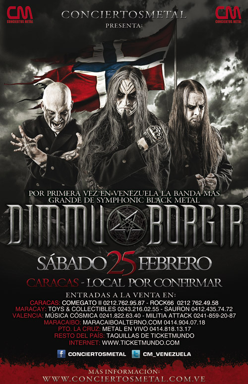 Información importante para los asistentes al concierto de DIMMU BORGIR este 25/02 en Caracas.NoticiasOXD[Eventos] por Frank Hernández - 22/02/201202/03/2012 CONCIERTOS METAL, empresa productora del evento DIMMU BORGIR en Venezuela informa lo siguiente a todos los asistentes al show del próximo sábado 25 de Febrero: La venta de entradas para la totalidad de los puntos del interior se mantendrá hasta el próximo jueves 23 de Febrero, mientras que los puntos de venta de Caracas tendrán entradas disponibles hasta el propio día del concierto hasta las 3:00 pm. De igual forma el día del evento a partir de las 11:00 am se habilitará un punto de venta de entradas en el estacionamiento de la Casa del Artista. Conciertos Metal no se hace responsable por entradas no adquiridas en los punto de venta oficiales, hemos detectado con preocupación en eventos anteriores la venta de “entradas falsificadas” las cuales al ser identificadas cancelan automáticamente el acceso de las personas al lugar del concierto. No pongan en riesgo la posibilidad de ver a la banda más importante de su género al comprar una entrada falsa y creer que se ahorran un dinero. La productora tendrá distintos dispositivos y niveles de seguridad para garantizar que sólo las personas con sus entradas “originales” disfruten del evento. Las puertas del Estacionamiento de la Casa del Artista serán abiertas a partir de las 6:00 pm. ZARDONIC deberá estar iniciando su actuación a partir de las 7:30 pm para alrededor de las 8:30 – 9:00 pm disfrutar la presentación de Dimmu Borgir. Se le insta a todos los asistentes ya en conocimiento de los horarios de presentación tomar sus previsiones al respecto.