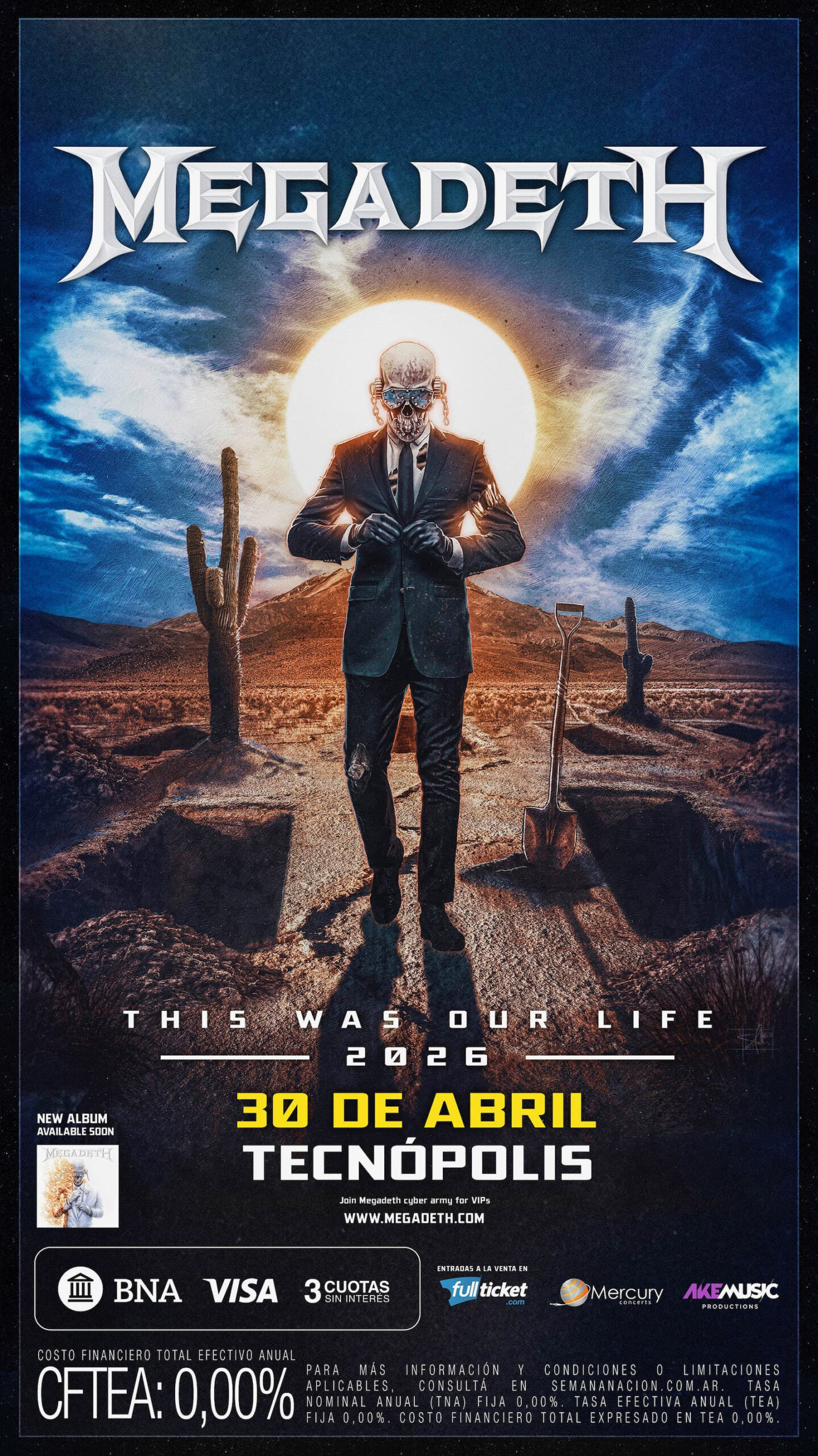 MEGADETH regresa a Argentina en 2026 con su tour despedidaArgentinaNoticias[Eventos] por Carlos Martinez - 09/12/202509/12/2025 La agrupación liderada por el emblemático Dave Mustaine regresa una vez mas al país es lo que promete ser su gira despedida junto a la presentación de su nuevo álbum homónimo en el marco de su tour «This Was Our Life 2026«, que también los llevará por Perú, Chile, Brasil, Colombia y México.La sinfónica del colorado actualmente compuesta por Dave Mustaine (Guitarra/Voz), Dirk Verbeuren (Batería), James Lomenzo (Bajo) y Teemu Mäntysaari (Guitarra), se preparan para sellar un legado de más de 40 años arriba de los escenarios.La cita está pactada para el Jueves 30 de Abril en Tecnópolis (Av. Juan Bautista de la Salle 4601, Villa Martelli). Las entradas están disponibles en la web de Fullticket a partir del 10 de diciembre a las 10 hs para clientes del banco BNA; y la venta general comenzará el 11 de diciembre a las 10 hs, con precios que van desde $130.000 hasta $270.000 (más cargos por servicio). Previamente hubo una preventa exclusiva el 8 de diciembre para miembros de la Cyber Army de MEGADETH.