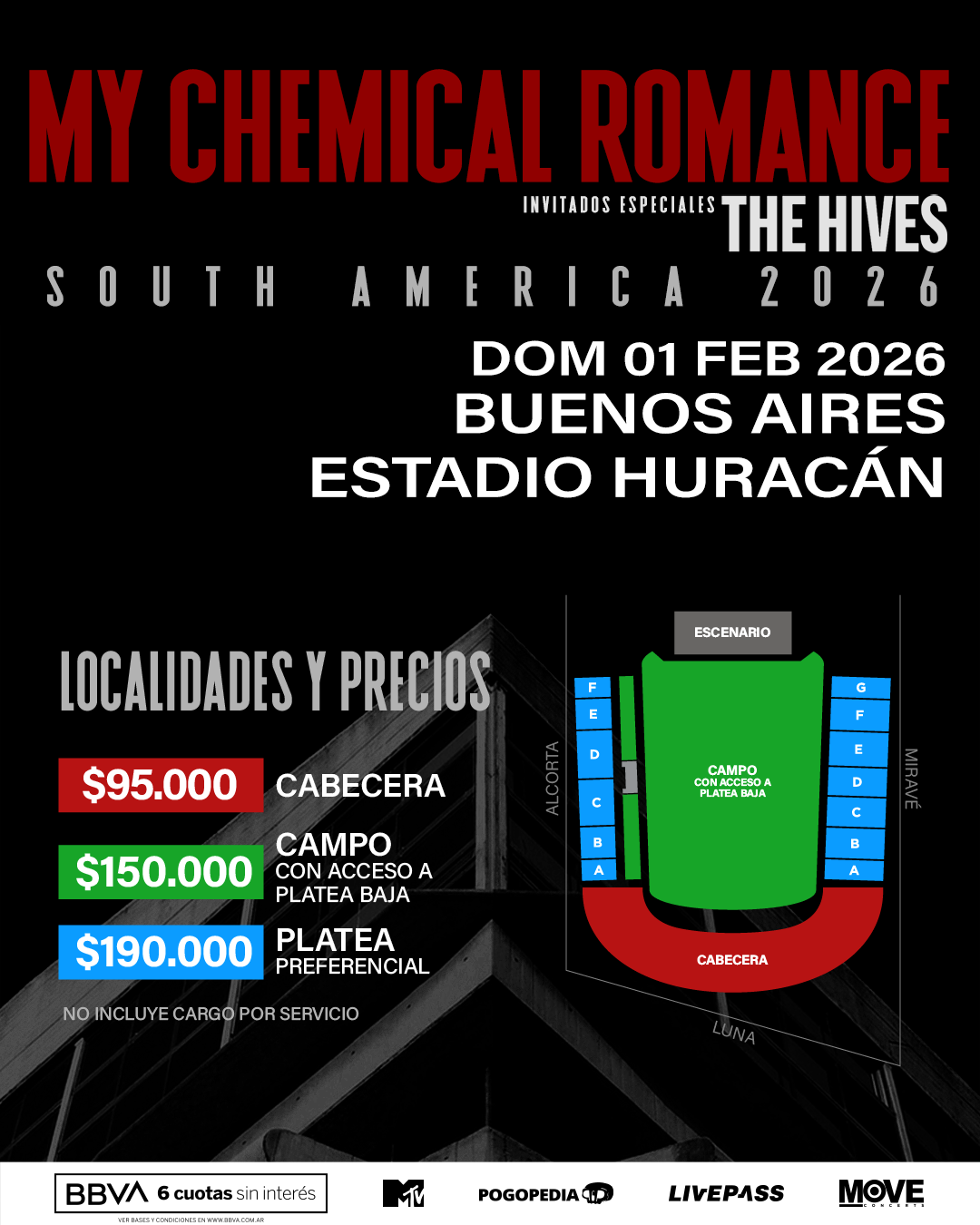 MY CHEMICAL ROMANCE regresará a Buenos Aires en 2026ArgentinaNoticias[Eventos] por Leticia Villalba - 25/06/202506/10/2025 La banda estadounidense de rock confirmó su visita a Argentina en el marco de «South America 2026 Tour». La fecha será el 1 de Febrero.Luego de 18 años, MY CHEMICAL ROMANCE regresará para presentarse en el Estadio Huracán con su esperada gira internacional por Latinoamérica. Como invitados especiales estará THE HIVES, una banda de rock formada por 5 integrantes proveniente de Suecia, conocida por sus enérgicas presentaciones en vivo. Con más de 30 años de trayectoria, los suecos regresan a Argentina tras su show del 2023.El reencuentro del grupo liderado por Gerard Way con el público argentino será el 1 de febrero de 2026 en el Estadio Tomas A, Ducó (Av. Amancio Alcorta 2544, CABA) en lo que promete ser un show histórico. La agrupación promete una noche histórica, con la intensidad, teatralidad y emoción que los convirtió en un fenómeno global.Entradas para MY CHEMICAL ROMANCE en Argentina – Precios y localidadesLos tickets para ver a MY CHEMICAL ROMANCE se pueden adquirir en la web de LivePass con valores que van desde $95.000 hasta $190.000 (más cargos por servicio). A continuación, la distribución de localidades y sus precios.Formada en Nueva Jersey en 2001, My Chemical Romance revolucionó la música con un estilo emocional, dramático y explosivo que redefinió el punk y el rock alternativo. Tras una pausa en 2013 y una reunión triunfal en 2019, la banda volvió a los escenarios para reencontrarse con su leal base de fans en todo el mundo. The Black Parade, lanzado en 2006, es considerado su obra cumbre y uno de los discos más influyentes del rock de los 2000. Reconocido por Rolling Stone como uno de los “500 mejores álbumes de todos los tiempos”, fue certificado cuatro veces Platino y su icónico single “Welcome to the Black Parade” alcanzó cinco certificaciones de Platino.