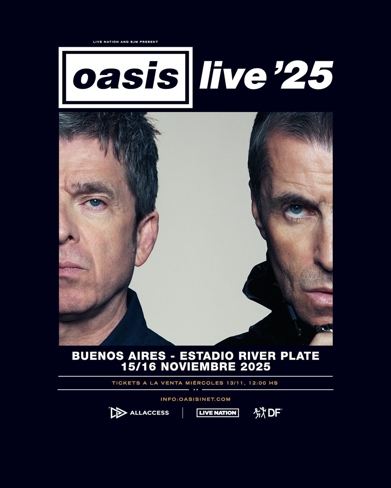 OASIS confirma su regreso a la Argentina en noviembre de 2025ArgentinaNoticias[Eventos] por Javier Brusotti - 06/11/202429/10/2025 Luego de haberse reunido tras más de 15 años separados, OASIS, la banda británica de rock alternativo formada en Manchester en 1991, anunció su regreso a Sudamérica en el marco de su gira mundial Oasis Live ’25. La serie de conciertos marca su reencuentro con el público de la región después de 16 años, en el contexto de una de las giras más esperadas del año.El grupo se presentará en Buenos Aires, Argentina, con dos funciones en el Estadio River Plate (Avenida Pres. Figueroa Alcorta 7597), el 15 y 16 de noviembre de 2025, producidas por DF Entertainment, Live Nation y SJM. Las entradas estarán disponibles a través de la plataforma AllAccess a partir del miércoles 13 de noviembre a las 12h. Luego de los conciertos en Argentina, la banda continuará su recorrido por Chile y Brasil.La gira Oasis Live ’25 marca las primeras actuaciones de la banda en América del Sur desde 2009, cuando los hermanos Liam y Noel Gallagher compartieron escenario antes de su separación. En esta nueva etapa, la agrupación retoma los clásicos de su repertorio, incluyendo temas como «Wonderwall», «Don’t Look Back in Anger» y «Champagne Supernova», junto con material de sus discos Definitely Maybe, (What’s the Story) Morning Glory? y Be Here Now, entre otros.