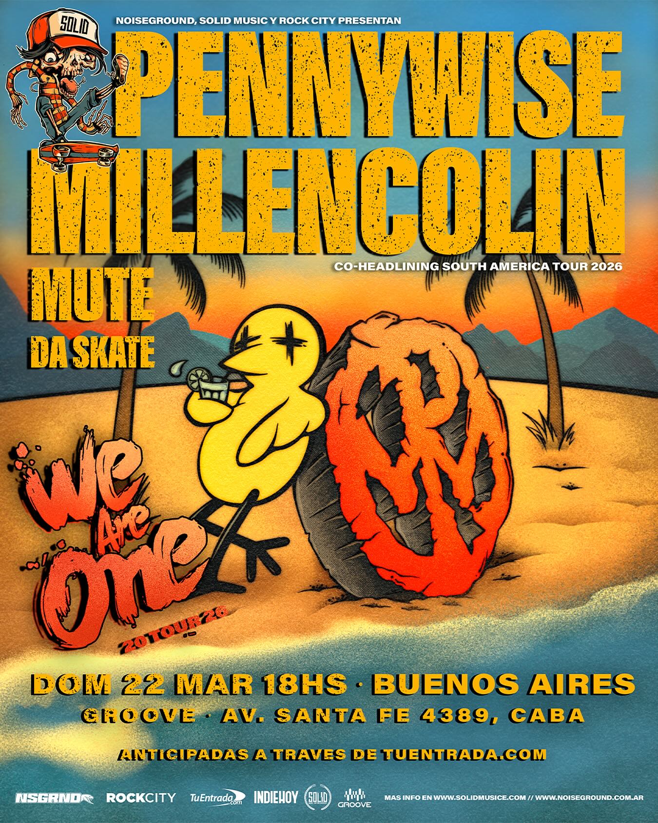 Se confirma una nueva edición del festival We Are One Tour, que tiene como objetivo reunir a grandes bandas de la escena del Punk Rock y Hardcore. Para esta edición del 2026 el evento regresa a la Argentina con las bandas PENNYWISE, MILLENCOLIN y MUTE. El show será el Domingo 22 de marzo 2026, 19hs en Palermo Groove, Av. Santa Fe 4389, Palermo, C.A.B.A. Entradas anticipadas en tuentrada.com con un valor de $115.000 (más servicios).