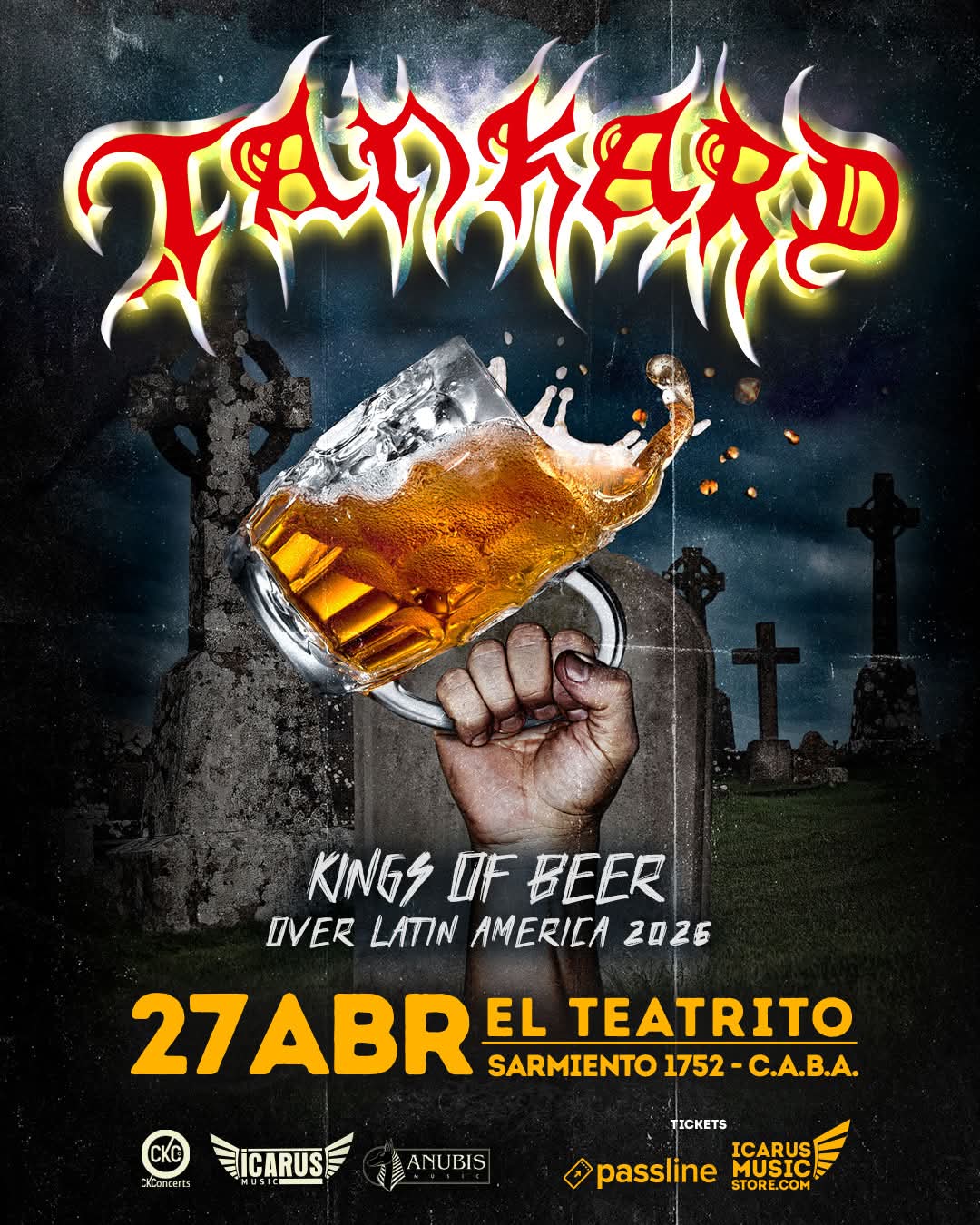 Preparen las birras, el Thrash de TANKARD regresa a la Argentina en 2026ArgentinaNoticias[Eventos] por Alejandro Gonzalez - 22/12/202508/01/2026 La legendaria banda de Thrash Metal alemán, TANKARD, regresa a Latinoamérica en Abril del próximo año, en el marco de su gira «Kings of Beer over Latin American 2026». Dicha gira los traerá por Colombia, Chile, Brasil, Argentina y México.La cita en Buenos Aires, Argentina, será el Lunes, 27 de Abril de 2026 en el El Teatrito – Sarmiento 1752 (C.A.B.A). Las entradas se encuentran disponibles a través de Passline y la web Icarus Music Store con valor de $90.000 (más costos de servicios).