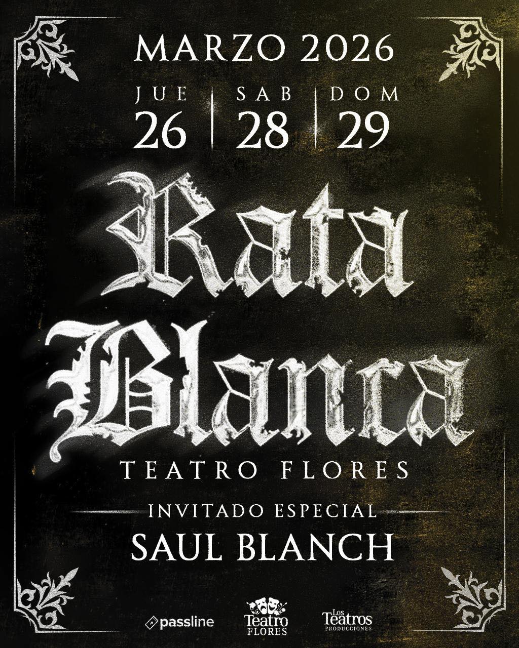 RATA BLANCA vuelve al Teatro Flores en 2026 con triple funciónArgentinaNoticias[Eventos] por Leticia Villalba - 21/11/202521/11/2025 La banda argentina de heavy metal se presentará el 26, 28 y 29 de marzo de 2026 en Buenos Aires, acompañados por Saul Blanch como invitado especial.Luego de celebrar los 35 años de «Magos, espadas y rosas» ante un Movistar Arena repleto, la banda liderada por Walter Giardino, anunció que volverá al Teatro Flores con una serie de shows.Además, la velada tendrá un condimento especial: Saúl Blanch, el primer cantante de la agrupación, será el invitado especial, marcando un encuentro esperado por los seguidores de la etapa inicial de RATA BLANCA.El encuentro tendrá lugar el 26, 28 y 29 de marzo del año próximo en el mencionado recinto del barrio porteño de Flores (Av. Rivadavia 7806, CABA) Las entradas (Preventa 1) se pueden adquirir en la web de Sistema PassLine con valores de $45000 (mas cargos por servicio)
