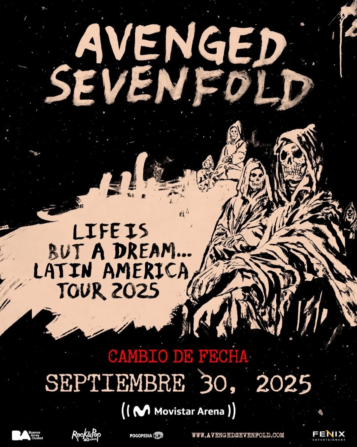 Show de AVENGED SEVENFOLD en Argentina cambia de fechaArgentinaNoticiasOXD[Eventos] por Redacción - 24/09/202527/09/2025 Debido a una enfermedad en la banda el concierto pautado para este 25 de septiembre se realizará el próximo 30 de septiembre en el mismo lugar: Movistar Arena de Buenos Aires.Quienes no puedan asistir a la nueva fecha podrán pedir la devolución de su dinero hasta el día 25 de septiembre a las 21 hrs.Para consultas puntuales, escribir a info@movistararena.com.ar Luego de 11 años de su última presentación en el país, AVENGED SEVENFOLD regresa a Buenos Aires como parte de su gira sudamericana “Life is But a Dream… Latin America 2025” que los llevará, además, por Chile, Brasil, Colombia, Puerto Rico y México.La banda, actualmente compuesta por M. Shadows (voz), Synyster Gates (guitarra), Zacky Vengeance (guitarra), Johnny Christ (bajo) y Brooks Wackerman (batería), se encuentra actualmente de gira promocionando su última placa discográfica, «Life Is But A Dream…» (2023) su octavo álbum de estudio y el mas experimental hasta la fecha combinando elementos de metal progresivo, jazz, música electrónica y clásica.
