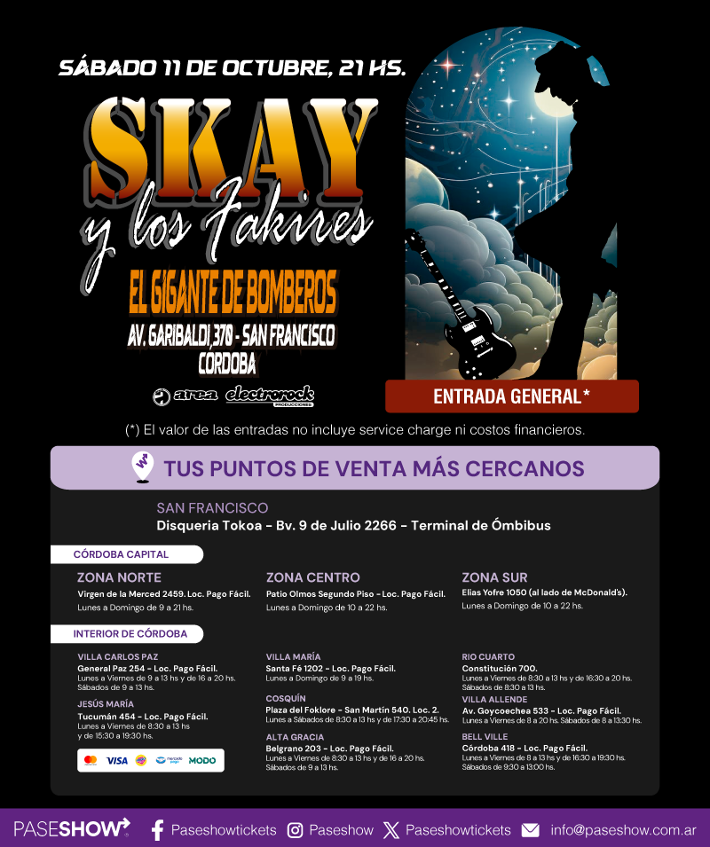 SKAY BEILINSON se presentará por primera vez en San Francisco, CórdobaArgentinaNoticias[Eventos] por Javier Brusotti - 04/10/202509/10/2025 SKAY BEILINSON, ex guitarrista de Patricio Rey y sus Redonditos de Ricota, llegará por primera vez a la ciudad de San Francisco, Córdoba, con su banda LOS FAKIRES como parte de la gira del disco Espejismos lanzado en 2023. El artista, uno de los máximos exponentes del rock nacional, interpretará canciones de su más reciente trabajo, además de sus éxitos más conocidos.El recital se llevará a cabo el 11 de octubre a las 21 horas en El Gigante de Bomberos, ubicado en Av. Garibaldi 370, San Francisco, Córdoba. Las entradas se encuentran a la venta a través de paseshow y sus puntos de venta. El precio es de $55.000 + costos de servicio.SKAY es conocido por haber sido uno de los miembros fundadores de Patricio Rey y sus Redonditos de Ricota, una de las bandas más influyentes de la historia del rock argentino. Tras la disolución de la banda en 2001, SKAY BEILINSON comenzó su carrera como solista, destacándose por su estilo único que fusiona el rock clásico con sonidos más contemporáneos y experimentales y ya lleva editados 8 discos.