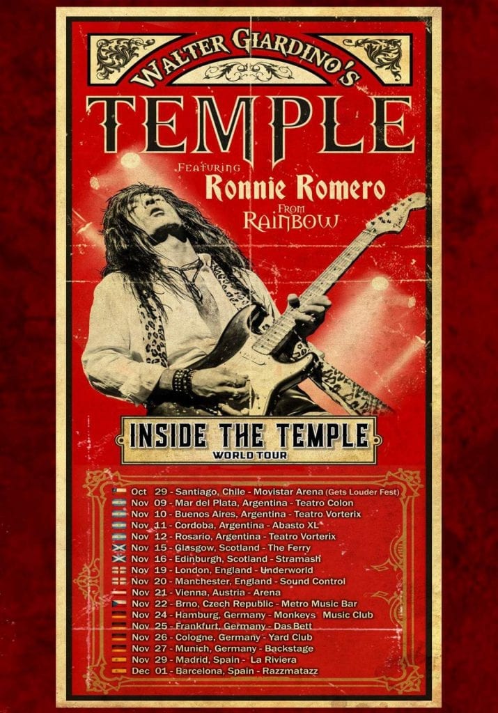 WALTER GIARDINO´S TEMPLE estará presentando una gira de más de 20 shows en Sudamérica y Europa, la que se iniciará en Chile en octubre y culminará en el Viejo Continente. Se repasarán temas del disco solista de TEMPLE pasando también por los clásicos de RAINBOW, DEEP PURPLE y demas grandes éxitos.